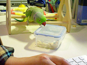 ハナ太郎は縁あって大阪の飼い主さんから引き取りました。元飼い主さんのところでは「ハナちゃん」と呼ばれていました。名前の由来は「鼻の穴が大きいから、ハナちゃん」だったそうです。身体が緑色なのでグリーン車に乗って帰って来ました。とっても贅沢インコです。はじめの3日間ほどか緊張してご飯を食べず、心配していました。今では差し出せば手からも食べてくれます。私の近くにわざわざ寄ってきて、ミカンをクチャクチャ音を立てて食べるのはやめて欲しいです。いつまでも元気でいて下さいね! ハナ太郎。